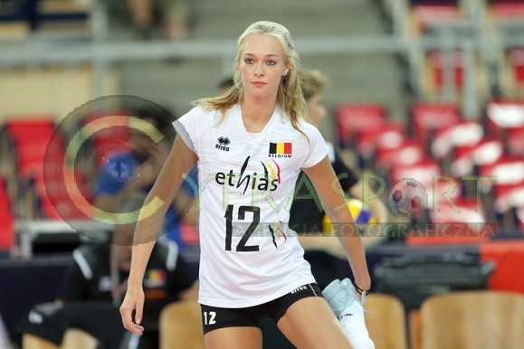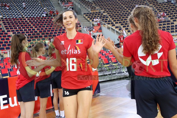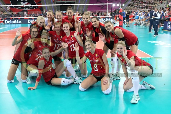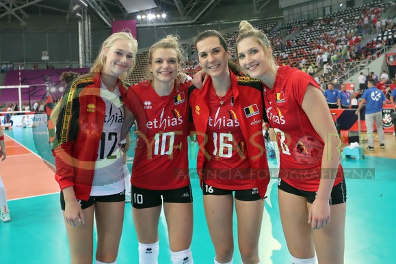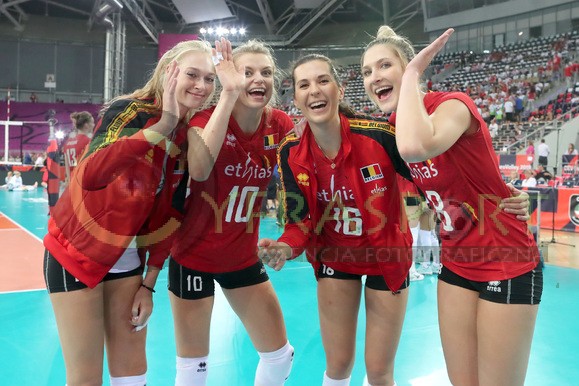 nz. RADOSC BELGIJEK PO WYGRANYM MECZU NA ZDJECIU ELISE VAN SAS , BROTT HERBOTS , NATHALI LEMMENS , CELINE VAN GESTEL KAJA GROBELNA DOMINIKA SOBOLSKA , BRITT RUYSSCHAERT , DOMINIKA STRUMILO , MARLIES JANSSENS ,KAROLINA GOLIAT , ILKA VAN DE VYVER , SILKE VAN AVERMAET , JODIE GUILLIAMS , MANON STRAGIER