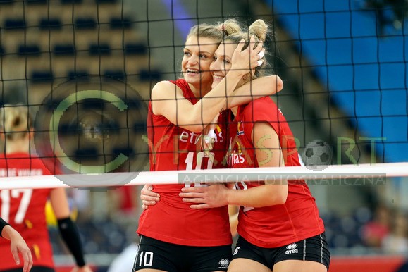 nz. BRITT RUYSSCHAERT ,CELINE VAN GESTEL , DOMINIKA SOBOLSKA , BROTT HERBOTS , KAJA GROBELNA , ILKA VAN DE VYVER RADOSC PO WYGRANYM MECZU